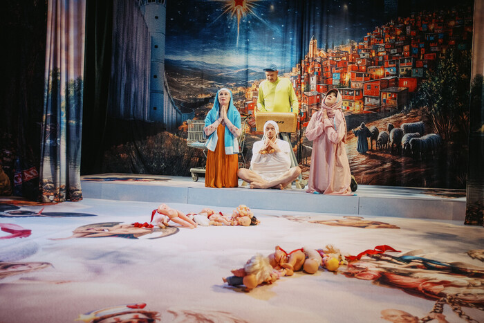 Avtorska ekipa se je besedila, ki so ga prvotno uprizarjali_e kot monodramo, lotila kolektivno, hudomušno in s kančkom glasbe. Potujoča igralska družina Selitvenega Slovenskega mladinskega gledališča tako duhovite prizore iz Jezusovega življenja preigrava z vidika sedanjosti in z zavedanjem, v kaj vse se je njegov konstruktivni, a naivni optimizem sprevrgel. Burkaški misterij v današnjih gordijsko zavozlanih časih, ki kar kličejo po radikalnem rezu, s pomočjo forme srednjeveških misterijev preizprašuje temelje naših družbenih dogovorov s krščanskim etosom na čelu.