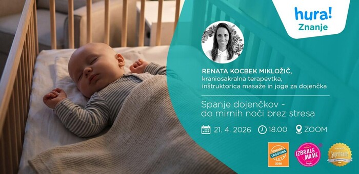 Predavanje bo v torek, 21. 4. ob 18. uri in bo potekalo preko spleta. Predava Renata Kocbek Mikložič, kraniosakralna terapevtka ter inštruktorica masaže in joge za dojenčke. Na predavanju boste izvedeli, kaj pomeni normalen spanec dojenčka, zakaj je pogosto zbujanje povsem naravno in kako lahko z dotikom, rutino, bližino ter nežnimi večernimi navadami ustvarite bolj mirno uspavanje. Govora bo tudi o tem, katere metode ne pomagajo in zakaj pristopi, ki temeljijo na joku in prisili, niso najboljša izbira.