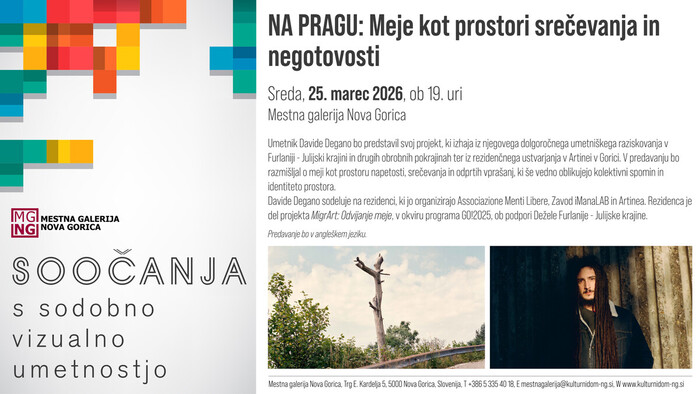 Italijanski umetnik Davide Degano bo v okviru programa Soočanja s sodobno vizualno umetnostjo v sredo, 25. marca, ob 19. uri v Mestni galeriji Nova Gorica predstavil svoj projekt, ki izhaja iz njegovega dolgoročnega umetniškega raziskovanja v Furlaniji - Julijski krajini in drugih obrobnih pokrajinah ter iz rezidenčnega ustvarjanja v Artinei v Gorici. V predavanju bo razmišljal o meji kot prostoru napetosti, srečevanja in odprtih vprašanj, ki še vedno oblikujejo kolektivni spomin in identiteto prostora.