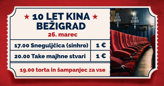 Leta 2015 je ekipa kino entuziastov zavihala rokave in Bežigrajčanom vrnila njihov dolgo izgubljeni kino. V Kinu Bežigrad je ponovno zabrnel projektor in zadišalo je po kokicah. 10 let nazaj so v Kinu Bežigrad sestavljali stole, napenjali platno in postavljali lokal. Danes je Kino Bežigrad veliko več kot samo kino. Drive-in kino, koncerti, gledališče, burgerji, predvsem pa prostor nepozabnih trenutkov. Desetletje nazaj je bilo mnogo stvari drugačnih, a v Kinu Bežigrad trdijo, da eno ostaja isto – brez vas ni njih. Ob tej priliki vas v sredo, 26. marca, vabijo na ogled dveh filmskih naslovov, katerima se lahko prepustite po simbolični ceni 1 €. In ker si vsak rojstni dan zasluži nekaj sladkega in malo mehurčkov, vas ob 19.00 pogostijo še s torto in penino.