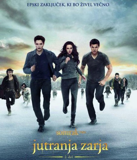 V epskem zaključku Somrak sage Bella uživa v novem življenju vampirke, toda z možem Edwardom se bojita za usodo njune hčerke Renesmee. Poleg zlobnih Volturov, ki jo želijo pokončati, težave povzroča tudi volkodlak Jacob. Ta je z Renesmee doživel vtisnjenje, s katerim volkodlaki najdejo svojo sorodno dušo. Toda ko Volturi napovedo svoj prihod, morata Bella in Edward za pomoč zaprositi prijatelje in z močjo njune nerazdružljive ljubezni obvarovati hčerko pred najhujšim. Somrak saga – Jutranja zarja 2. del v slovenska kina prihaja 15. novembra.