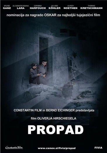 producent BERND EICHINGER izvršni producent CHRISTINE ROTHE fotografija RAINER KLAUSMANN montaža HANS FUNCK glasba STEPHAN ZACHARIAS žanr: vojna drama Dolžina: 156 min, oznaka R http://www.deruntergang-special.film.de/ http://www.cenex.si/fivia/propad/ MMIV Constantin Film Produktion GmbH, All Rights Reserved © 2005 FIVIA Vojnik, Vse pravice pridržane Distribucija v Sloveniji: FIVIA - Vojnik
