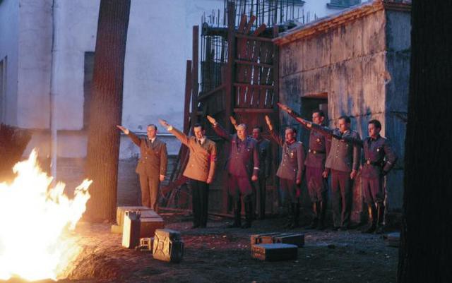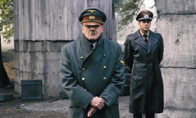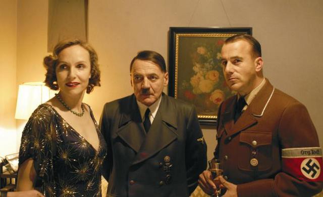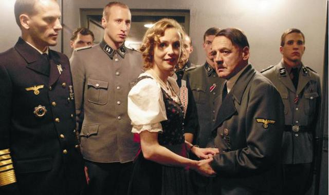 osebami tistega časa in njihovo primitivno ideologijo. Kar lasje so mi šli pokonci." Hirschbieglov prvi in edini kandidat za vlogo Hitlerja je bil švicarski igralec Bruno Ganz, ki nastopa tako v gledališču kot v filmu - evropskem, pa tudi ameriškem. V Wendersovem "Nebu nad Berlinom" je upodobil angela, poleg Gregoryja Pecka in Laurenca Olivierja je nastopil v filmu "Fantje iz Brazilije", igral je v Herzogovem "Nosferatu - fantom noči" in nedavno tega v Demmejevem "Mandžurskem kandidatu", če