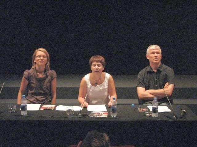 Opis fotografije: Nina Peče se nahaja na sredini med Petro Slatinšek (filmska vzgoja in program za otroke in mlade Kinobalon) in pomočnikom direktorice za program (Koen Van Daele)