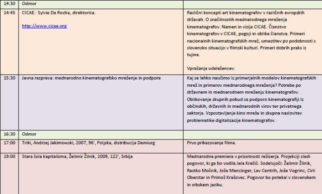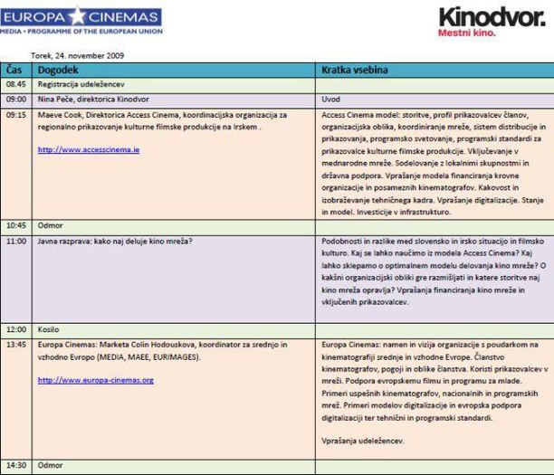 Namen dvodnevnega strokovnega srečanja z naslovom »Mreže in digitalizacija art kinematografov« je predstaviti delovanje in prednosti mednarodnih kinematografskih mrež Europa Cinemas, prve mreže prikazovalcev s poudarkom na evropskem filmu, art kino mreže CICAE (Confédération Internationnale des Cinémas d'Art et d'Essai) ter primer Access Cinema - nacionalne mreže prikazovalcev na Irskem. Predvsem v drugem dnevu srečanja pa bodo predstavljeni procesi digitalizacije kinematografov v Evropi, pomen in nujnost skladnega prehoda na digitalno tehniko ter izgledi za digitalno tranzicijo v Sloveniji.
