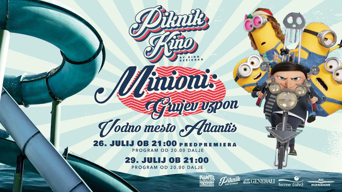 Ob 21.00 pa predpremierno sledi zgodba, ki bo razkrila 12-letnega Gruja, ki je želel postati največja baraba na svetu, pri tem pa mu bodo seveda pomagala rumena nagajiva bitja. Kino Bežigrad obljublja zabaven družinski kino večer, Minioni pa, da se boste od srca nasmejali in se naučili kup uporabnih traparij, predvsem, kakšen je recept za uspeh največje barabe na svetu in zakaj so banane najboljše. Zaradi velikega povpraševanja bo Kino Bežigrad enak družinski zabavni dogodek v Vodnem mestu Atlantis organiziral tudi v petek, 29. julija.