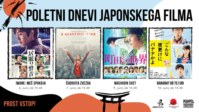 Kino Bežigrad bo v sodelovanju z Japonskim veleposlaništvom v Ljubljani junija v svojo dvorano ponovno pripeljal vzdušje daljnega vzhoda. Poletni dnevi japonskega filma se bodo odvijali med 6. in 10. junijem ter s pestrim programom zadostil široki množici ljubiteljev tuje kino distribucije. Ogledali si boste lahko dramo »Iwane: Meč spokoja«, uživali v dramatični družinsko znanstveni fantastiki »Čudovita zvezda«, se podali v romantičen »Machidin svet« in se nasmejali ob komediji »Banana? Ob tej uri?«. Vse filmske projekcije bodo predvajane v japonščini s slovenskimi podnapisi, brezplačne vstopnice pa si lahko že zagotovite na blagajni Kina Bežigrad.