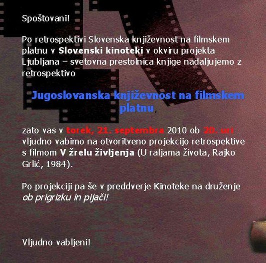 Od 21. septembra do 2. oktobra vam, v sodelovanju z Jugoslovansko kinoteko iz Beograda, ponujamo retrospektivo velikin jugoslovanskih literatov z upodobitveno spretnostjo filmskih avtorjev. Naj vam zaupamo nekaj naslovov. Film hrvaškega režiserja Rajka Grlića V žrelu življenja (U raljama života, 1984, avtor literarne predloge: Dubravka Ugrećić) bo otvoril jugoslovansko filmsko-književno navezo. Sledili bodo: srbski film in prvi barvni jugoslovanski celovežerec Pop Čira in pop Spira (Pop Čira i
