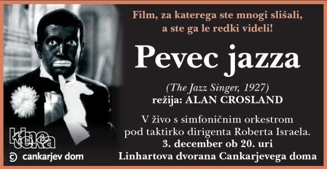V Linhartovi dvorani Cankarjevega doma v četrtek, 3. decembra 2009, ob 20. uri. Slovenska kinoteka že tradicionalno v sodelovanju s Cankarjevem domom predstavlja filmsko projekcijo z glasbeno spremljavo, odigrano v živo. Letos vam predstavljamo prvi zvočni celovečerni film Pevec jazza (The Jazz Singer, Alan Crosland, 1927).