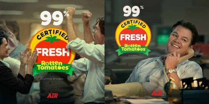 Verjamemo, da zagriženi filmofili dobro poznajo spletni portal po imenu Rotten Tomatoes. Baza podatkov, ki zbira recenzije, informacije in novice povezane s filmom je dober vir navdiha pri izbiranju, kaj si želimo ogledati v kinu. Film AIR, ki govori o eni najuspešnejših športnih blgovnih znamk vseh časov, vodi pa ga oskarjevska igralska zasedba z Mattom Damonom in Benom Affleckom na čelu, je na omenjenem portalu dosegel neverjetnih 99%, proglašen pa je bil za enega najboljših športnih filmov vseh časov! Vse pohvale, zavidljivo oceno, 99% in odlične kritike pa je na portalu Rotten Tomatoes dosegel še pred svojo premiero. Film v kina po Sloveniji v distribuciji Blitz Filma prihaja že v četrtek, 6. aprila.