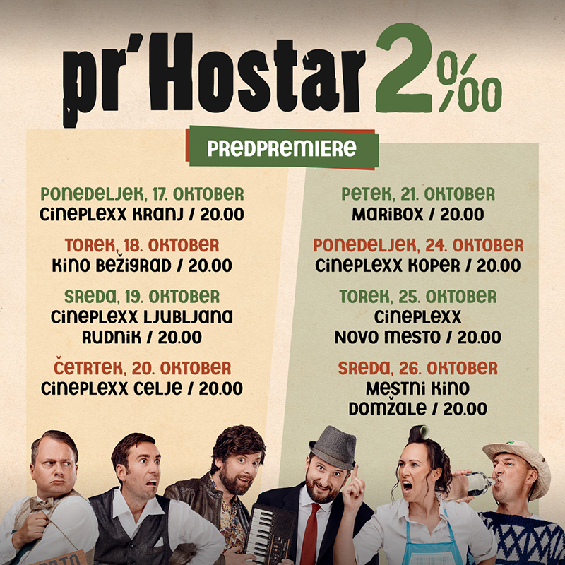 Emona, 28. september 2022 – Po prvem dražilniku, ki je vzbudil apetit, se gorenjski gaunarji vračajo s svežim napovednikom in napovedjo osmih predpremiernih projekcij za težko pričakovano nadaljevanje domače komedije. Slednje se bodo odvile v kinematografih Cineplexx, Maribox, Kino Bežigrad in Mestni kino Domžale, oboževalci pa bodo po vstopnice zanje lahko šibali že ta petek, 30. septembra. PR'HOSTAR 2‰ sicer na redni spored prihaja 27. oktobra, ko bodo Hostarji zavzeli kina širom Slovenije. Sodeč po odzivih na t. i. »prkolo« oziroma napovednik je občinstvo že »ugvantano« za novo porcijo avtohtone izkušnje med neotesanimi domorodci.