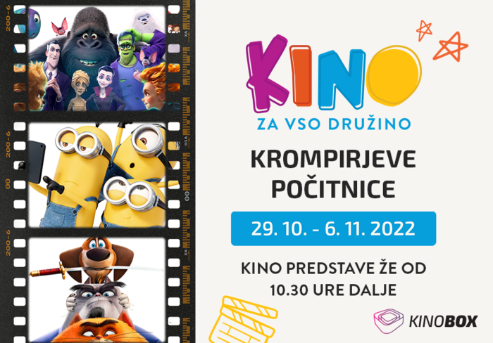 V času krompirjevih počitnic, od 29. 10. do 6. 11. 2022, smo, tako za najmlajše kot tiste malo starejše, v MARIBOXU pripravili poseben počitniški program. S kino predstavami bomo dnevno začenjali že od 10.30, do 16. ure pa si boste lahko vse filme ogledali po matinejski ceni. V ponedeljek in torek za vse filme in risanke velja akcija KINO PONEDELJEK in SUPER TOREK.
