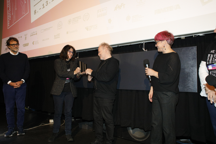 10. 10. 2024 - V Hiši filma - Palazzo del Cinema v Gorici je danes, 10. oktobra 2024, potekala slavnostna podelitev nagrade Darko Bratina, ki jo je Kinoatelje letos izročil priznanemu francoskemu režiserju Nicolasu Philibertu (naslovna fotografija). Ta je pred podelitvijo tudi vodil mojstrsko delavnico. Svečani dogodek je bil del čezmejnega filmskega festivala Poklon viziji, ki se z bogatim filmskim programom odvija med 8. in 13. oktobrom. Izjemoma smo nagrado podelili že v dopoldanskem času zaradi nepredvidenih okoliščin, ob 20. uri pa kot napovedano v Hiši filma sledi slovesna projekcija Philibertovega filma Adamant z video pozdravom nagrajenca.