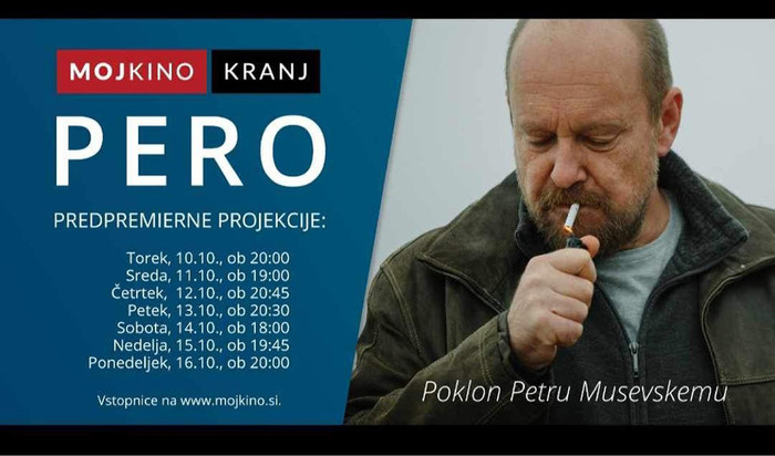 Kranj, 5. 10. 2023 – Film Pero je biografski portret pokojnega igralca Petra Musevskega v režiji Damjana Kozoleta. Svetovno premiero je doživel na mednarodnem filmskem festivalu v Rotterdamu, sedaj pa svojo kinematografsko pot začenja v Kranju. Tam, kjer so ljudje Perota vzeli za svojega, medtem ko so ga skozi leta občudovali v nepozabnih vlogah na odru Prešernovega Gledališča Kranj. Tokrat Pero prihaja na filmsko platno novega mestnega kina MOJKINO Kranj na Stritarjevi 1, kjer bodo gostili niz predpremiernih projekcij. Prva se bo odvila v torek, 10. oktobra, na Svetovni dan duševnega zdravja.