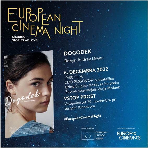 V torek, 6. decembra ob 19.30 se v Kinodvoru z brezplačno projekcijo francoskega filma Dogodek (L'événement, Audrey Diwan, 2021) pridružujemo noči evropskega filma. Film je posnet po romanu letošnje Nobelove nagrajenke Annie Ernaux. Po projekciji se bo o njenem delu s pisateljico Brino Švigelj-Mérat preko Zooma pogovarjala Varja Močnik.