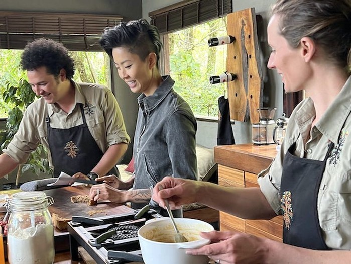 Jedi: Chef Rolando Chamorro in chefinja Kristen Kish postrežeta ploske kruhke s popečeno zelenjavo, “bruschetto Mamecillo” s svežim kozjim sirom in medenim prelivom, nenavaden “ceviche” iz čajote, Kolandovega dimljenega piščanca z omako iz sadeža naranjilla in vodno krešo ter Gabriellin sladoled z marmelado iz divjih jagod.