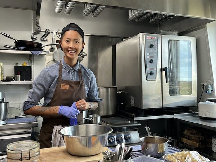 Jedi: Chefinji Carolynn Ladd in Kristen Kish postrežeta kmečko solato s prelivom iz pinjenca, koruzni zdrob s popečenim češnjevcem, Carolynnin zavitek z jastogom na kolačkih s pinjencem, ostrige z domačo pekočo omako in Kristenino izvirno sladico, imenovano Koze, ki pasejo morsko travo, katera vsebuje narastek s prelivom, maskarpone s karamelo iz kozjega mleka, morsko travo, ekspandiran riž in sladkor v prahu.
