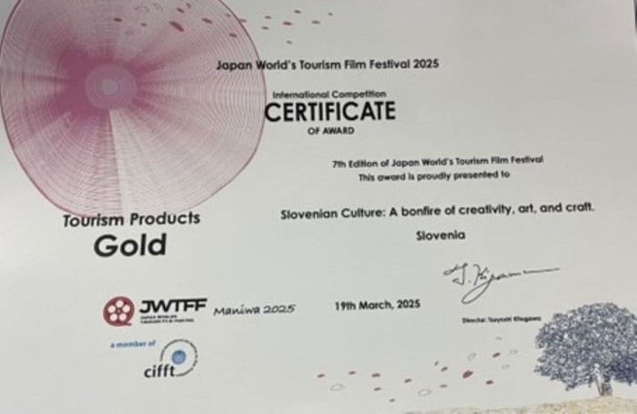 Svetovni festival turističnih filmov na Japonskem (Japan World’s Tourism Film Festival) tudi letos odpira festivalsko sezono prestižnega tekmovanja Mednarodnega združenja festivalov turističnih filmov CIFFT. V sredo, 19. marca, so na slavnostni prireditvi zaključili tridnevni festival v Maniwa-city-ju v Okayami in nagradili turistične filme iz celega sveta. Mednarodna žirija strokovnjakov s področja marketinga, produkcije in turizma je med vsemi prispelimi videi nagradila tudi dva slovenska videa, ki ju je STO lansirala v letu 2024. Videu Slovenian Culture: A bonfire of creativity, art, and craft., je pripadla zlata nagrada v kategoriji promocije turističnih produktov, videu Slovenia. It's all in our nature. pa srebrna nagrada v kategoriji promocije držav. Video ‘Slovenian Culture: A bonfire of creativity, art, and craft.’ krepi prepoznavnost Slovenije z bogato tradicijo, zgodovino in kulturnimi dosežki, ki je hkrati tudi ustvarjalna in urbana. Video ‘Slovenia. It's all in our nature.’ s prizori neokrnjene narave in vrhunskih slovenskih športnikov na edinstven način povezuje šport, neokrnjeno naravo in privlačnost naše dežele ter krepi ponos njenih prebivalcev.