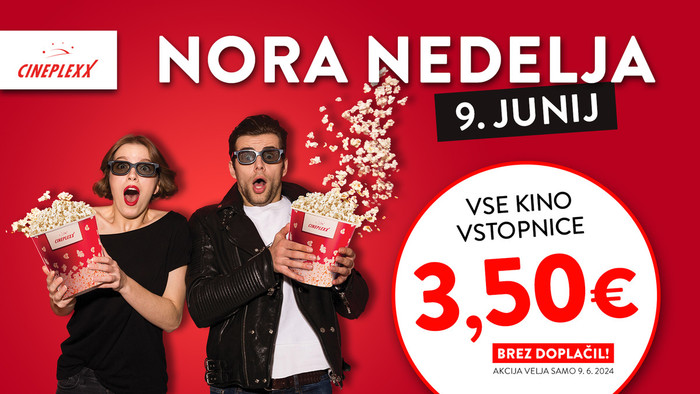 V sedmih Cineplexx kinih po Sloveniji bodo ljubitelje filma na velikem platnu navduševali aktualni filmski naslovi, ki si jih bo mogoče ogledati po NORI CENI, 3,50 evra, le v nedeljo, 9. junija. Enotna akcijska cena kino vstopnic 3,50 evra (brez doplačil) velja za vse filme; tudi za filme v 3D, daljše od 120 in 150 minut ter za VIP in VIP DELUXE sedeže. Kina bodo svoja vrata v nedeljo odprla že ob 11. uri. Vstopnice za nedeljske projekcije so že v prodaji preko spleta na (www.cineplexx.si),