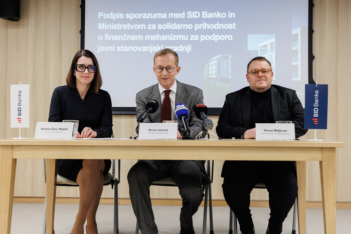 Ljubljana, 11. marec 2026 - Minister Simon Maljevac, predsednik uprave SID banke Borut Jamnik in članica uprave SID banke Stanka Šarc Majdič so včeraj na sedežu slovenske izvozne in razvojne banke podpisali sporazum, ki opredeljuje finančni mehanizem za podporo gradnji javnih najemnih stanovanj do leta 2034. Z oblikovanjem mehanizma država odgovarja na pozive stanovanjskih skladov in lokalnih skupnosti po ugodnih posojilnih virih za gradnjo javnih najemnih stanovanj.