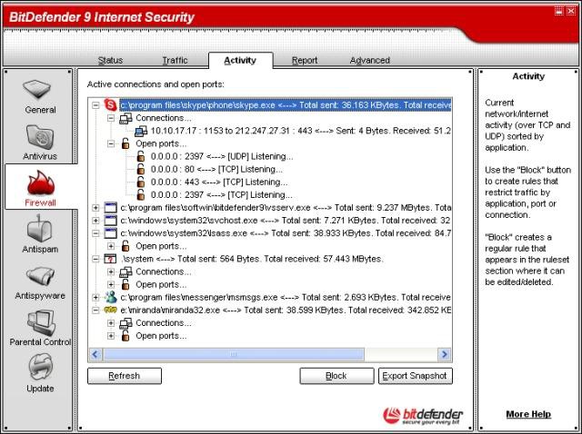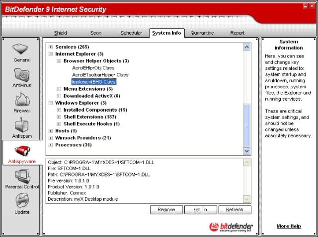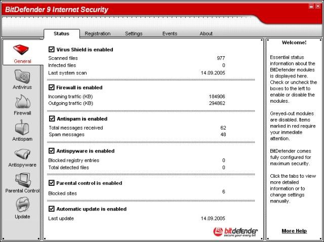 BitDefender 9 Internet Security prinaša dolgo pričakovano antispyware zaščito – program sumljive aktivnosti blokira v realnem času, še preden le-te lahko poškodujejo sistem. Obsežna baza znanega spyware programja skupaj z novo hevristiko, ki škodljivce odkriva že v ničlah in enicah, poskrbi, da bo vaš računalnik brez nadležnih črvov, trojancev, programov, ki beležijo udarce na tipkovnico in druge nesnage. Seveda vsebuje tudi odličen protivirusni pogon ter AntiSpam/AntiPhishing zaščito.