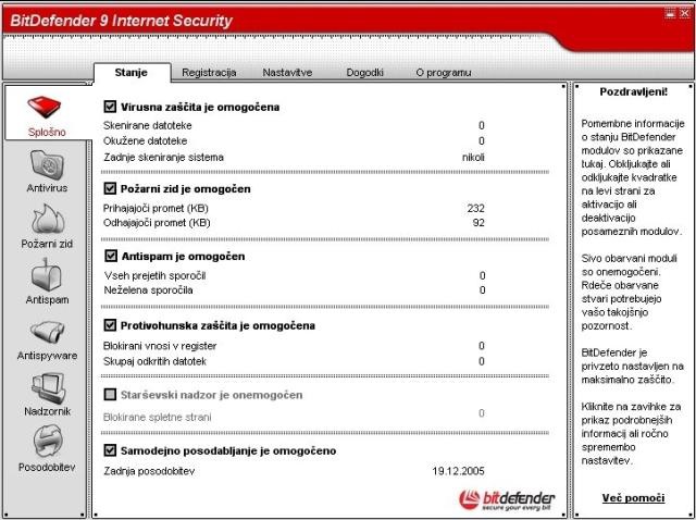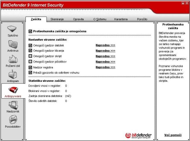 Družina je sedaj popolna in vsa govori slovensko. Slovenski jezik domačim uporabnikom še olajša sicer enostavno delo s protivirusnim programom, priložena so natančna in izčrpna navodila za uporabo ter tehnična dokumentacija. BitDefender 9 Internet Security prinaša dolgo pričakovano antispyware zaščito – program sumljive aktivnosti blokira v realnem času, še preden le-te lahko poškodujejo sistem. Obsežna baza znanega spyware programja skupaj z novo hevristiko, ki škodljivce odkriva že v ničlah