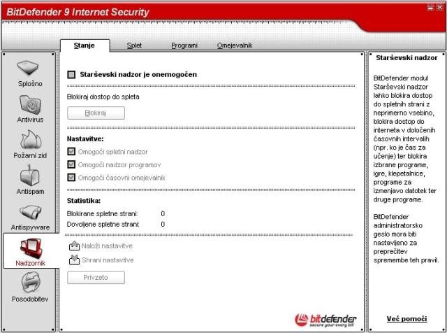 se lahko pohvali še z novim modulom t.i. »starševski nadzor« (ang. parental control), ki vsebuje cel kup koristnih orodij za zaščito računalniških vsebin in je tako bržkone najbolj popoln varnostni paket na tržišču ta trenutek. Brezplačna 30-dnevna preizkusna različica je že voljo za dolvleko s spletne strani podjetja Parametica – www.parametica.si. Kupci licence bodo za slovenski BitDefender 9 Internet Security odšteli 12.925 SIT, različa Professional velja 8.955 SIT, medtem ko različico