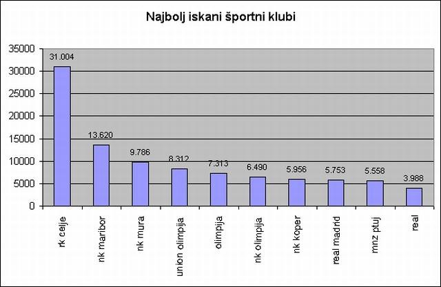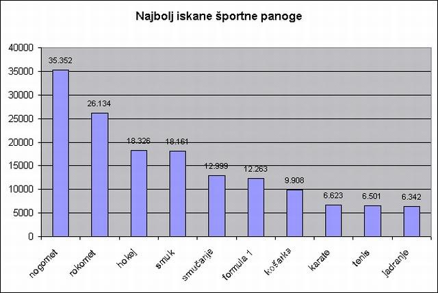 Nogometna zveza Slovenije (33.147 iskanj); sledita ji Rokometna zveza Slovenije (23.316 iskanj) in Plavalna zveza Slovenije (17.088 iskanj). Med športnimi tekmovanji so na vrhu lestvice iskanih Olimpijske igre (17.191 iskanj), sledita pa Ljubljanski maraton in Šolska košarkarska liga.