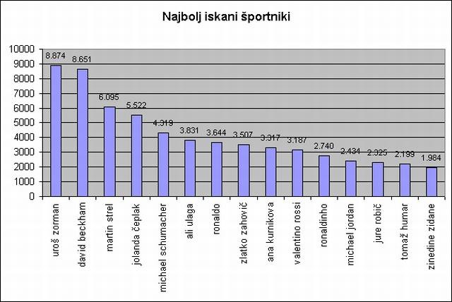 Najbolj iskan športnik v letu 2004 je rokometaš Uroš Zorman z 8874 iskanji, sledijo mu David Beckham (8651 iskanj), Martin Strel (6095 iskanj), Jolanda Čeplak (5522 iskanj) in Michael Schumacher (4319 iskanj). Med športnimi klubi je bil daleč najbolj iskan Rokometni Klub Celje; sledita mu Nogometni Klub Mura in Union Olimpija. Med športnimi panogami so po iskanosti na vrhu nogomet (35.352 iskanj), smučanje (31.160) in rokomet (26.146 iskanj). Najbolj iskana športna zveza v 2004 je bila