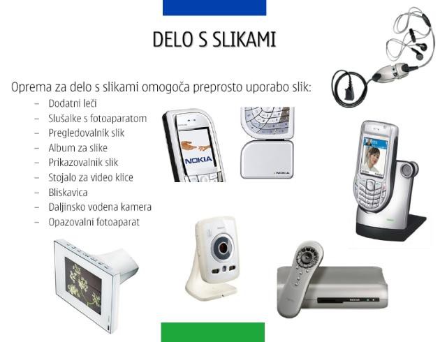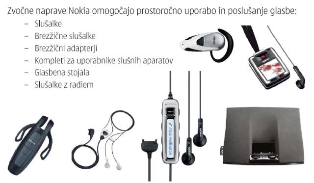 slogu kot mobilni telefoni in podpira funkcionalnost, ki jo nudi posamezni telefon, saj je načrtovana skupaj s telefoni. Najnovejši produkti iz skupine dodatne opreme Nokia so brezžična tipkovnica (Nokia Wireless Keyboard SU-8W), bliskavica (Nokia Camera Flash PD-2), ki v kratkem prihajata na tržišče, ter slušalke z zaslonom (Nokia Display Headset HS6), ki jih je Nokia pred nekaj dnevi predstavila na srečanju 3GSM World Congress v Cannesu.