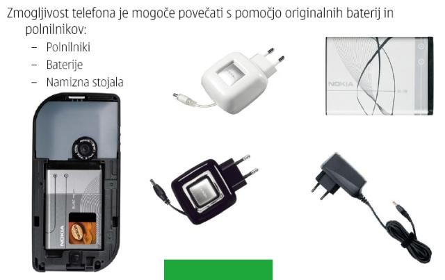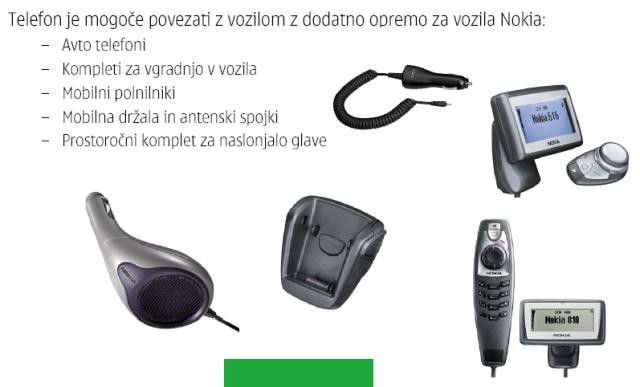 partnerje in kupce. Nokia se bo tudi v prihodnje trudila, da bi čimbolj omejila uporabo ponarejenih in neoriginalnih delov, hkrati pa bo svojim uporabnikom ponujala varne, uporabniku prijazne in cenovno ugodne mobilne rešitve, ki obogatijo uporabo mobilnih telefonov in vsakdanje življenje. Dodatna oprema Nokia daje mobilnim uporabnikom več udobja, moči in poveča uporabnost telefona. Nokia ponuja dodatno opremo, ki je primerna tako za prijetno druženje in zabavo kot za delo, saj se deli na več