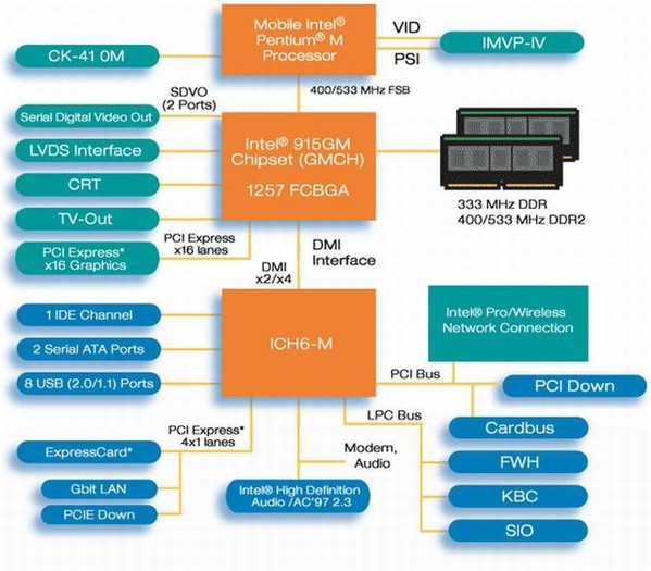 Nov je tudi nabor čipov, optimiziran za manjšo porabo energije in manjše velikosti, ki bo domačim in poslovnim uporabnikom korenito izboljšal delovanje grafike. Grafično jedro Intel Graphics Media Accelerator ima energetsko optimizirano vodilo s taktom 533 MHz in podporo za dvokanalni pomnilnik DDR2, kar pripomore k dvakrat zmogljivejšem delovanju grafike v sistemih z integriranim grafičnim vmesnikom na naboru čipov Mobile Intel 915GM Express. Poleg tega nova mobilna tehnologija Intel Centrino