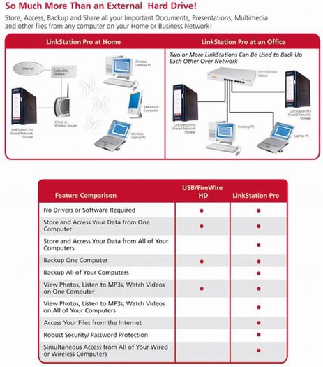 Naprave LinkStation Pro so petkrat hitrejše kot naslednja najhitrejša naprava NAS z enojnim diskom, ki je na voljo. Odlikujejo jih izredno hiter procesor in pogon SATA, ki omogoča prenos podatkov do 35 MB/s, ter številne napredne lastnosti, med katere sodijo preprost zagon, funkcija FTP-strežnika in podpora integraciji z Active Directoryjem. (aNET)