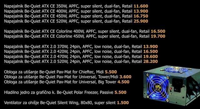udobje in brezskrbno delo v vročih poletnih dneh. Ponudba podjetja Be Quiet ponuja še zelo zmogljive, posebej tihe računalniške ventilatorje – Silent Wings, katerih glavna značilnost je zgolj 20db “hrupa” ob delovanju in jamstvo najmanj 45 tisoč ur delovanja. Ventilatorji Silent Wings tako skupaj z napajalniki BQT P4 ali P5 ter kompletom za absorbcijo šumov, dajejo občutek, ki ga doslej pri računalnikih niste poznali, občutek skoraj popolne tišine. www.anni.si