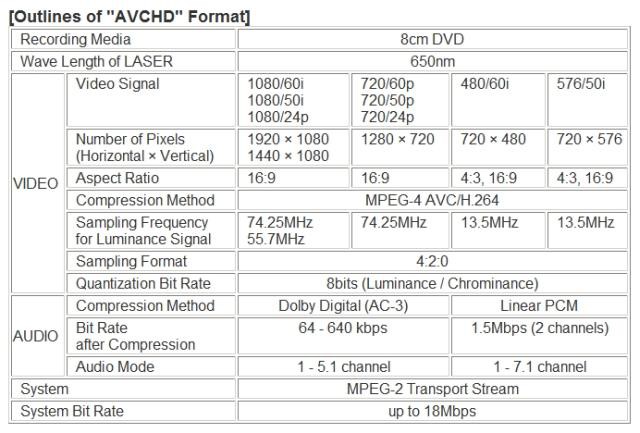 Format AVCHD omogoča zapisovanje in predvajanje digitalnih posnetkov visoke ločljivosti z uporabo 8-centimetrskih medijev DVD. Temelji na kodekih MPEG-4 AVC/H.264 in Dolby Digital (AC-3) ali Linear PCM. (aNET)