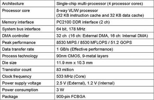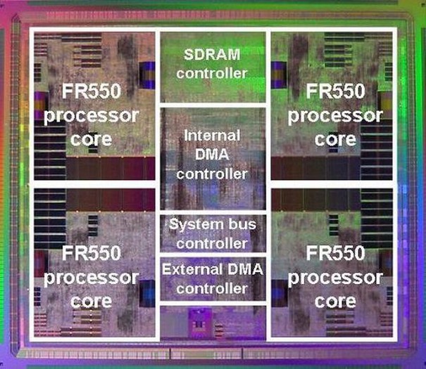 Ta procesor samo z uporabo programske opreme omogoča obdelavo slik s hitrostjo 51,2 GOPS (milijard operacij na sekundo) ter prenos podatkov s hitrostjo 1 GB/s. (aNET) http://www.fujitsu.com/global/news/pr/archives/month/2005/20050207-01.html/"">Vec o tem...