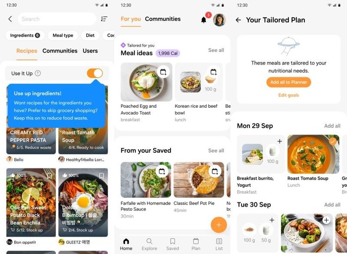 Samsung Food+ nadalje zagotavlja načrte obrokov na podlagi uporabnikovega seznama živil, da bi podprl cilje trajnostne prehranske prakse, saj vsak načrt prilagodi na podlagi sestavin na uporabnikovih seznamih živil in prednostno razvrsti tiste, ki jim poteče rok uporabe. Z novo funkcijo »Iskanje s seznamom živil« (Search with Your Food List) pa se bodo recepti s sestavinami s seznama živil prikazali na vrhu rezultatov iskanja in uporabnikom pomagali z idejami, kaj je mogoče pripraviti s tistim, kar imajo. Na podlagi seznama živil so na voljo tudi priporočila za recepte. Vse, kar je bilo uporabljeno s seznama živil, pa je priporočeno dodati na nakupovalni seznam. Ta inteligentni pristop pomaga pri vzdrževanju zalog in zmanjšuje količino zavržene hrane, hkrati pa zagotavlja sveže in okusne obroke.