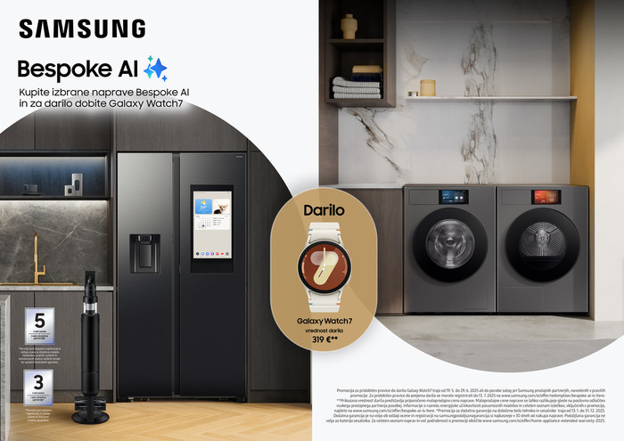 Ljubljana, 19. maj 2025 - Podjetje Samsung Electronics je nedavno predstavilo svojo najnovejšo linijo naprav bele tehnike. Bistvo sodobne tehnologije je v povezanosti, enostavni uporabi in praktičnosti. To je vizija, ki jo prinaša podjetje Samsung in hkrati razlog za novo promocijo. Dobite več in bolj prilagojeno izkušnjo za enako ceno! V promocijskem obdobju od 19. 5. 2025 do 29. 6. 2025 ob nakupu izbranih Samsung hladilnikov, pralnih strojev, sušilnih strojev in sesalnikov prejmete v dar pametno uro Samsung Galaxy Watch7. Nismo vsi mojstri za gospodinjska opravila, a tudi tisti, ki to so, bi si z veseljem omislili pomočnika, ki bi jim te naloge olajšal, pospešil in obenem poskrbel za boljše rezultate.