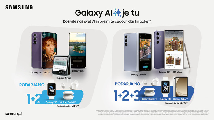 Vsi kupci, ki bodo med 5. aprilom in 5. majem 2024 kupili telefon Galaxy S24, Galaxy Z Flip5, Galaxy S23 ali Galaxy S23 FE bodo prejeli darilni paket fitnes zapestnico Galaxy Fit3 in brezžične slušalke Galaxy Buds FE. Ob nakupu Galaxy S24 Ultra,Galaxy S24+ ali Galaxy Z Fold5 pa bodo kupci prejeli darilni paket tablični računalnik Tab A9 4/64 Wi-Fi, Galaxy Fit3 in Galaxy Buds FE. Vse informacije in pogoje najdete na spletni strani Samsung. Promocija velja pod pogojem registracije v
