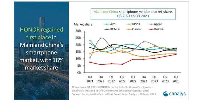 [Ljubljana, 2. november 2023] Glede na zadnje poročilo o tržni uspešnosti, ki so ga objavili Counterpoint, Canalys in IDC, se je HONOR v tretjem četrtletju 2023 vrnil na prvo mesto v tržnem deležu pametnih telefonov na Kitajskem.
