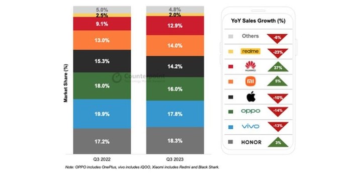 Poročilo Counterpoint je poudarilo, da je HONOR osredotočen na ponudbo cenovno dostopnejših izdelkov srednjega razreda s promocijskimi cenami za trgovce na drobno in potrošnike ter da se je ta strategija izkazala za učinkovito. HONOR tako na trgu vodi z 18,3-odstotnim deležem, zahvaljujoč nedavno predstavljenima pametnima telefonoma HONOR X50 in HONOR 90. Serija HONOR X50 se je osredotočila na izboljšanje vzdržljivosti kot nove edinstvene prodajne točke, ki je dodala zagon pošiljkam v tretjem četrtletju. Po drugi strani pa je HONOR pokazal ambicije v kategoriji preklopnih pametnih telefonov, vključno z ohišjem HONOR V in Magic Vs2, ki potrošnikom ponuja različne specifikacije in cenovne razrede naprav.