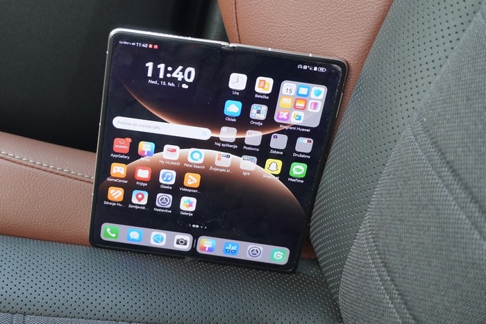 zadeva oblikovanje, bodo mnenja različna. Osebno se zdi pomembneje, da naprava ostaja zelo tanka in da ima zunanji zaslon klasično razmerje stranic. Prav ti dve lastnosti namreč najbolj vplivata na udobje uporabe, ko je telefon zaprt. V praksi to pomeni, da Mate X7 brez težav uporabljamo tudi kot običajen telefon, kar pri prepogljivih modelih ni vedno samoumevno.