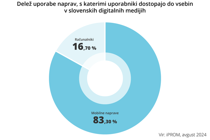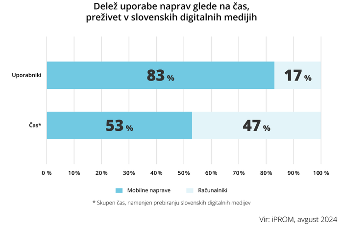 LJUBLJANA, 20. avgust 2024 - Večina uporabnikov slovenskih digitalnih medijev do medijskih vsebin dostopa prek mobilnih naprav. Delež mobilnega dostopa namreč v letošnjem letu dosega že približno 83 odstotkov, kaže najnovejša analiza družbe iPROM. Kljub večji uporabi mobilnih naprav za dostop do digitalnih vsebin pa uporabniki za poglobljeno pregledovanje vsebin še vedno uporabljajo namizne računalnike, kjer je aktivnost za več kot dvakrat višja kot na mobilnih napravah. Hkrati v dnevnem povprečju uporabniki slovenskih digitalnih medijev preživijo petkrat več časa na namiznih računalnikih kot na mobilnih napravah.