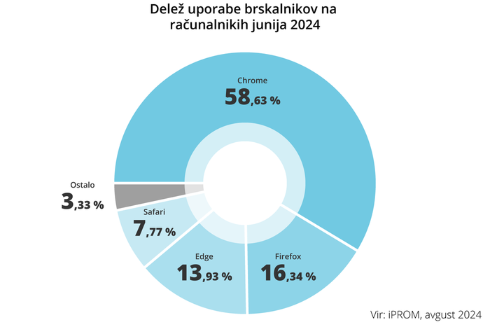Chrome z 58,63-odstotnim deležem še vedno vodi med spletnimi brskalniki na namiznih računalnikih, čeprav je zabeležil blag padec v primerjavi z lanskim letom, ko je zavzemal 59,83 odstotka skupne razdelitve. Firefox je rahlo izboljšal svojo prisotnost na trgu, saj se je njegov delež povečal z lanskih 15,70 odstotka na 16,34 odstotka letos. Microsoft Edge prav tako kaže rahlo rast, saj se je njegov delež povečal za 1,17 odstotne točke, in sicer z 12,76 odstotka na 13,93 odstotka, medtem ko je