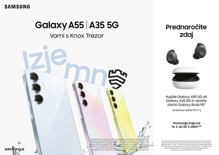 Od danes, 14. marca, do 28. marca oziroma do razprodaje zalog, traja promocijsko obdobje, v katerem bo Samsung ob nakupu zgoraj omenjenih naprav uporabnikom ob predhodni prijavi prek aplikacije Samsung Members podaril brezžične slušalke Galaxy Buds FE. Več informacij o pogojih te posebne ponudbe je na voljo na spletni strani Samsung (https://www.samsung.com/si/offer/galaxy-a-series-2024/).