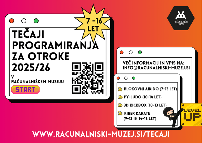 V Računalniškem muzeju v Ljubljani imamo vpise odprte še do 5. oktobra 2025, za inovativne tečaje programiranja, ki združujejo znanje, ustvarjalnost in strokovni pristop. V našem učnem doju (jap.: "kraj učenja") bodo otroci postali pravi programerski samuraji, ki bodo pod vodstvom inštruktorja razvijali spretnosti, razumevanje, spoštovanje in samodisciplino – veščine, ki jih bodo potrebovali za ustvarjanje in reševanje izzivov v digitalnem svetu. Računalniški muzej v Ljubljani deluje kot center neformalnega izobraževanja na širokem področju ustvarjalne rabe digitalnih tehnologij.