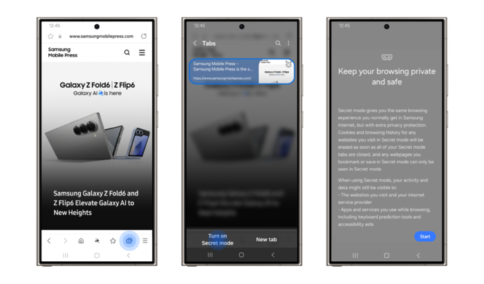 Za dodatno varnost Samsung Internet omogoča tudi zasebna okolja s skrivnim načinom (Secret Mode). To vam lahko pride prav pri nakupovanju darila, ki ga želite ohraniti kot presenečenje za vse, ki bi lahko imeli dostop do vaše naprave. S to možnostjo boste imeli enako izkušnjo brskanja, kot jo običajno doživite v storitvi Samsung Internet, vendar z dodatno zasebnostjo in zaščito. Piškotki in zgodovina brskanja za vsa spletna mesta, ki jih obiščete v skrivnem načinu, bodo izbrisani iz telefona takoj, ko boste zaprli vse zavihke v skrivnem načinu. Shranite lahko tudi strani in zaznamke, vendar bo vse, kar shranite, vidno samo v skrivnem načinu. Če želite uporabljati to funkcijo, pojdite v Samsung Internet in na glavnem zaslonu tapnite ikono zavihki desno na dnu, kjer lahko upravljate odprte strani. Vklopite Skriti način tako, da tapnete Vklopi skrivni način.