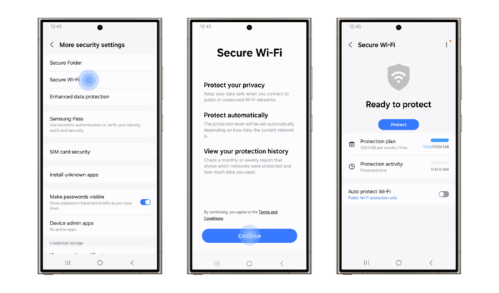 Z Galaxy lahko delate na daljavo bolj mirno, saj veste, da so vaši občutljivi podatki in informacije manj izpostavljeni potencialnim grožnjam javnih omrežij. Varen Wi-Fi ponuja celo brezplačno zaščito do 1024 MB na mesec, ki se samodejno aktivira ob vzpostavitvi povezave[1], za tiste, ki želijo nadgradnjo, pa so kadar koli na voljo dodatni paketi.