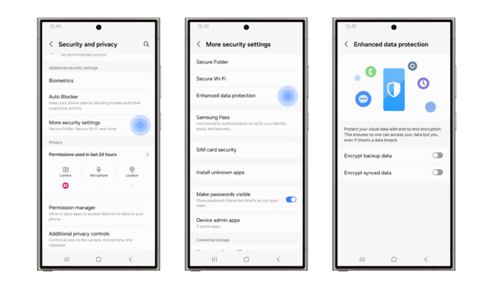 Izboljšana zaščita podatkov od telefonov serije Galaxy S24 naprej zagotavlja dodatno zaščito naprav Galaxy, ko sinhronizirate ali varnostno kopirate podatke s storitvijo Samsung Cloud.[2] Ta funkcija zmanjšuje izgubo podatkov s šifriranjem od konca do konca (E2EE), ki zagotavlja, da se podatki lahko šifrirajo ali dešifrirajo samo v vaši napravi in jih ne more videti nihče razen vas. Z drugimi besedami, lahko se povežete z drugimi napravami, pri tem pa ostanete varni, vaši podatki pa bodo na varnem tudi v primeru ogrožanja strežnika ali kraje podatkov o računu.