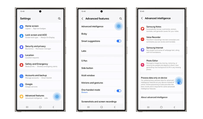 Napredne nastavitve inteligence: Samsung se kot vodilni svetovni proizvajalec osredotoča na izboljšanje izkušenj z napravami z namenskimi funkcijami umetne inteligence, hkrati pa daje prednost zasebnosti v dobi umetne inteligence. Številne funkcije Galaxy AI uporabljajo obdelavo podatkov v napravi, kar pomeni, da občutljivi podatki ostanejo samo in izključno pri vas. Pri tistih funkcijah, ki zahtevajo obdelavo v oblaku ali zunanjih strežnikih, poskrbimo, da so vaši podatki zaščiteni s strogimi pravili.